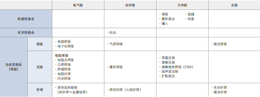 将金属连接在一起的主要方法,包括“机械性接合”及“冶金性接合”。 机械性接合,包括“螺栓接合”、“铆接”、“敛缝”、“热套”、“镶入”等,这些接合方法均借助了力学领域的能量。 而相对的,冶金性接合则分为“熔接”、“压接”、“钎焊”等方法,不同的接合方法对应使用不同的能量。 此外还有属于化学性接合,采用粘合剂的接合方法。 不同的接合方法各有优缺点,要实现有效接合,就必须根据不同的材料及接合条件,选择恰当的接合方法。