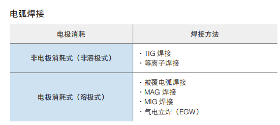 在“熔接”中,“电弧焊接”也是在各种工业领域被广泛应用的焊接法。 根据特征、装置结构、使用的气体等有更具体的分类,其中“TIG 焊接”、“MIG 焊接”、“MAG 焊接”等可以用保护气体将焊接部和大气隔离开来 的气体保护电弧焊,由于非常适合自动化,被广泛应用。 包括气体保护电弧焊在内的“电弧焊接”大致可分为焊接棒(或焊丝)熔化的“电极消耗式(溶极式)”和不熔化的“非电极消耗式(非溶极式)” 两种。