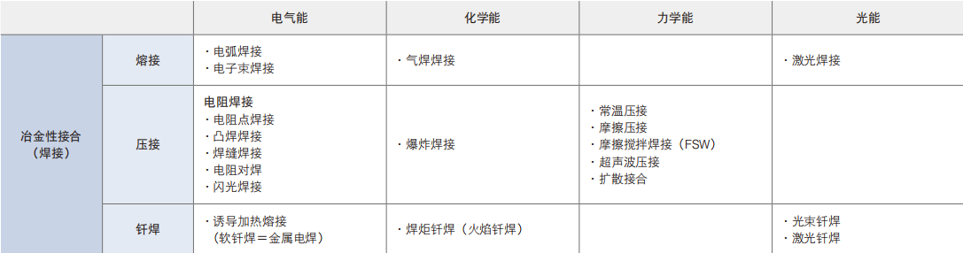 根据接合方法不同,焊接大致可分为三类。 将母材和母材熔化或将接合母材所需的焊接棒(焊材)和母材熔化并接合的“熔接”;利用机械摩擦、压力、电流等使母材熔化并接合的“压接”; 在接合部分使用接合所需的焊材(钎)以进行焊接的“钎焊”。 同时,针对各种接合方法,还有各种各样的焊接方法,可根据要接合的母材和条件等因素,使用合适的焊接方法。