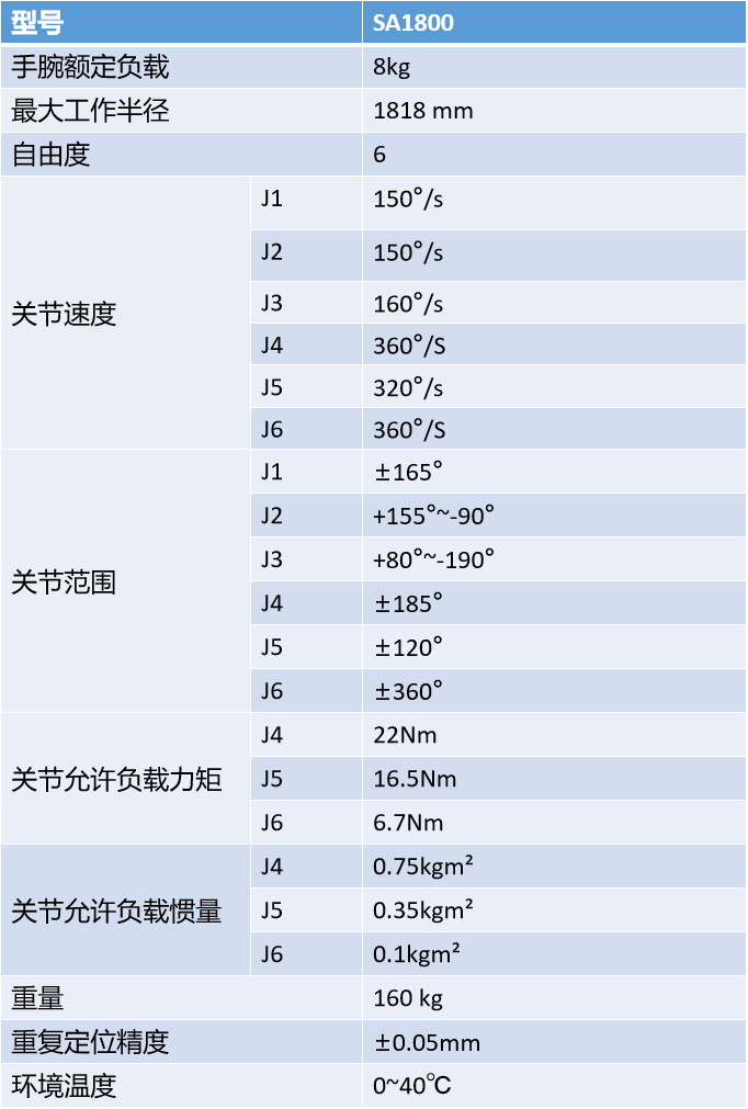 SA 1800特性:手腕负载为8Kg,工作半径为1818mm。