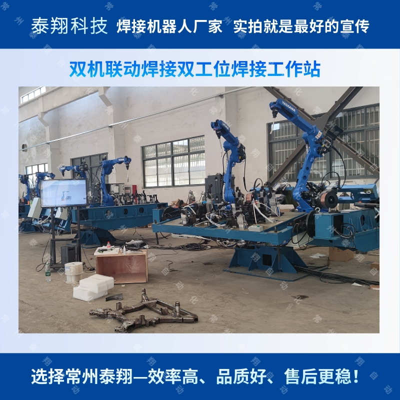 常州泰翔自动化设备科技公司为客户定制的副车架焊接工作站即将调试完成,该工作站采用安川机器人双机联动焊接,搭配双工位水平旋转变位机实现高效焊接,欢迎咨询方案详情!