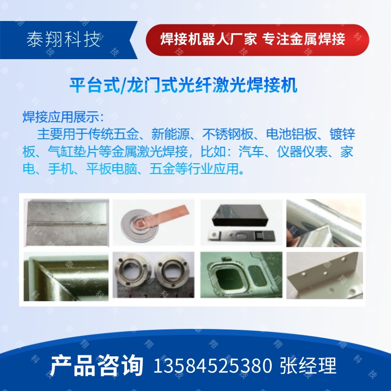 主要用于传统五金、新能源、不锈钢板、电池铝板、镀锌板、气缸垫片等金属激光焊接,比如:汽车、仪器仪表、家电、手机、平板电脑、五金等行业应用。